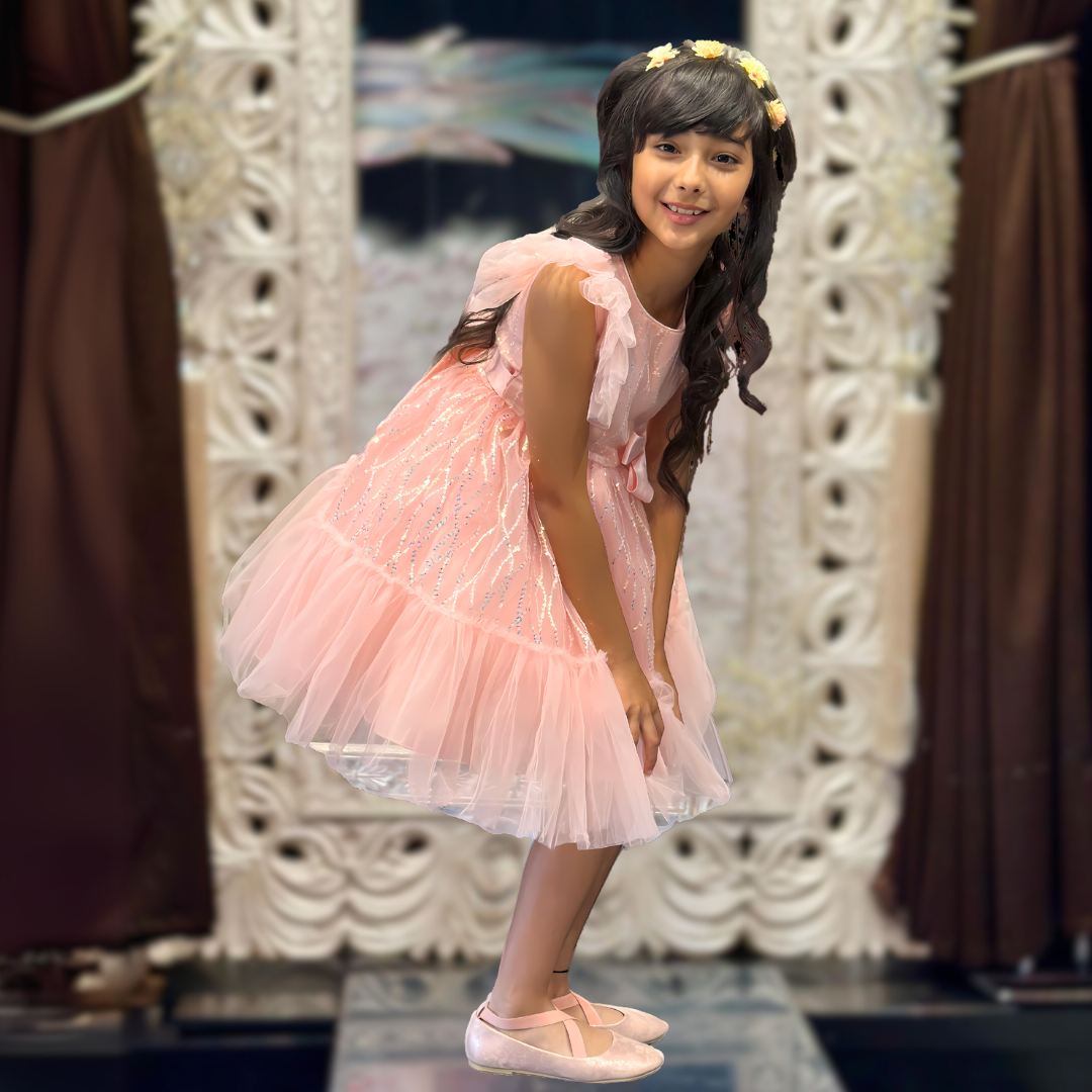 It has a fitted bodice with ruffled sleeves and a full, layered skirt. The bodice and skirt are glittered with sequins. You can tie a ribbon at the back. The dress made out of tulle and organza.