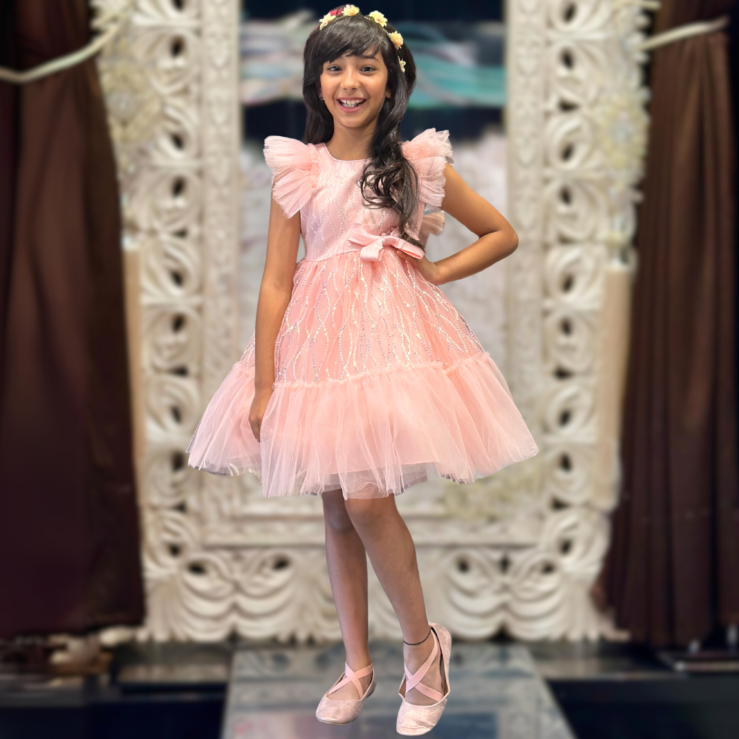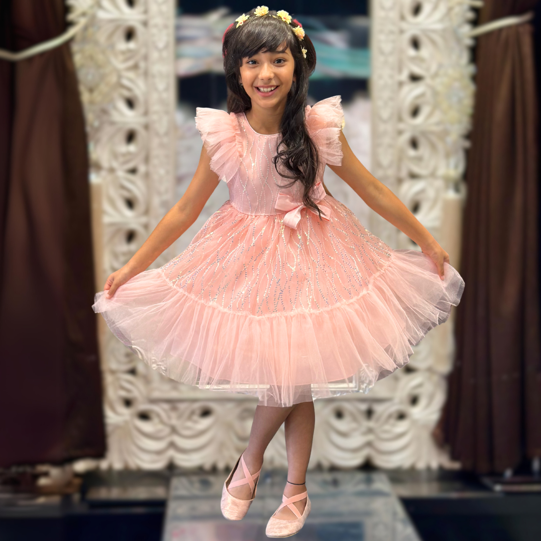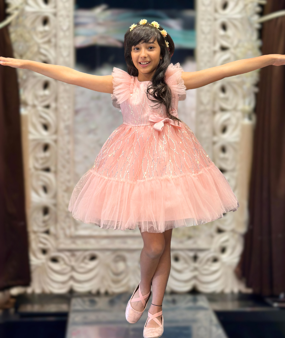 A beautiful peach dress which has a fitted bodice with ruffled sleeves and a full, layered skirt. The dress has a bowknot on the bodice and a tulle fabric which creates a voluminous and playful effect.