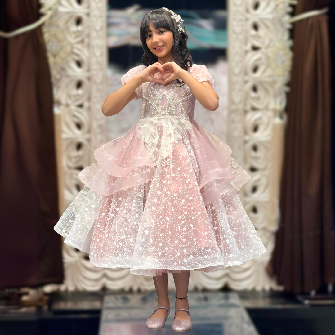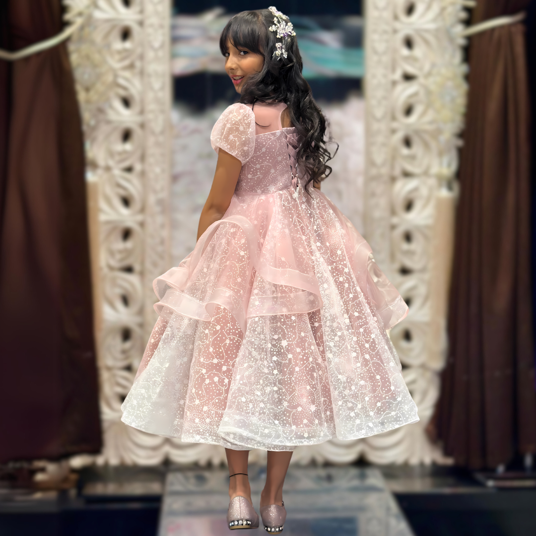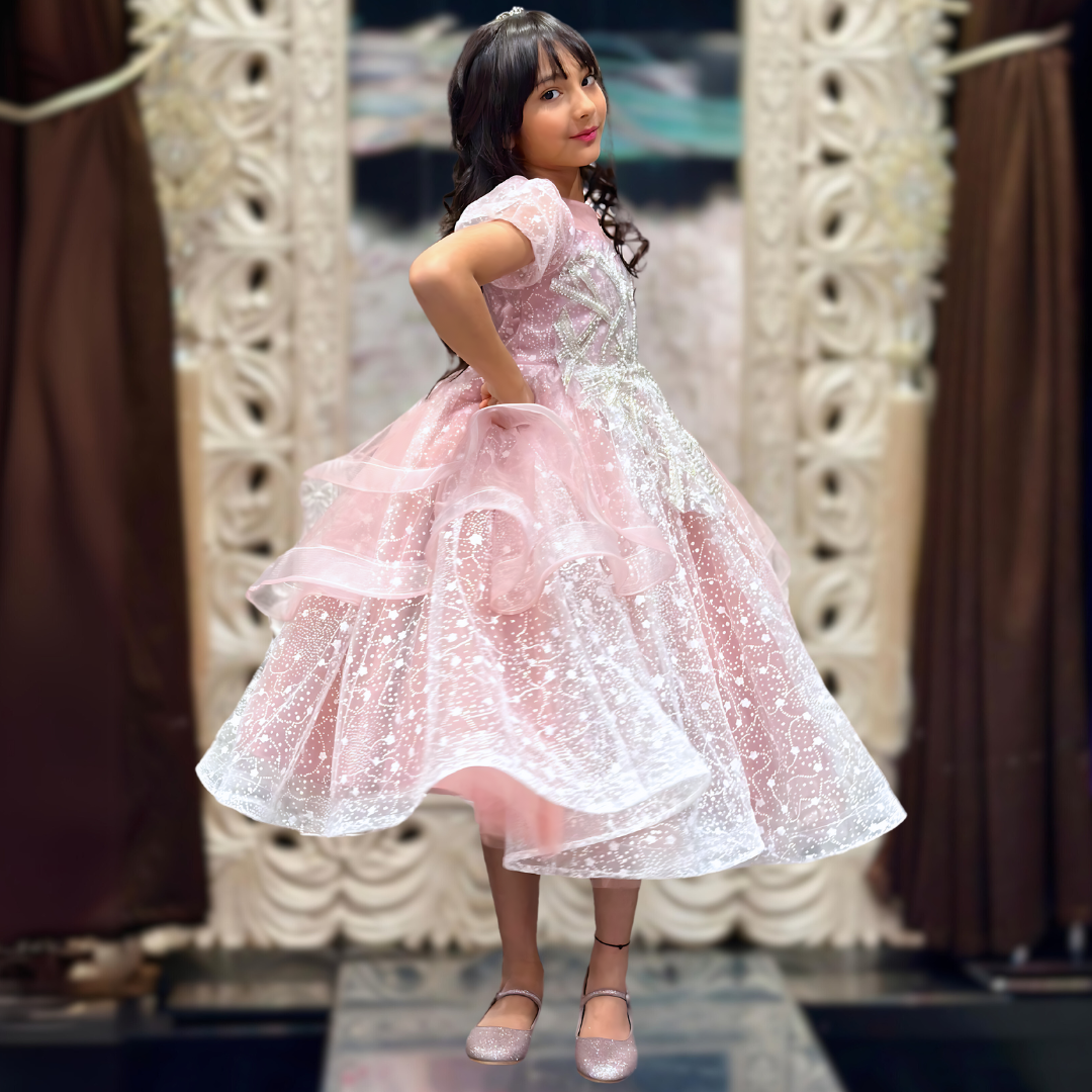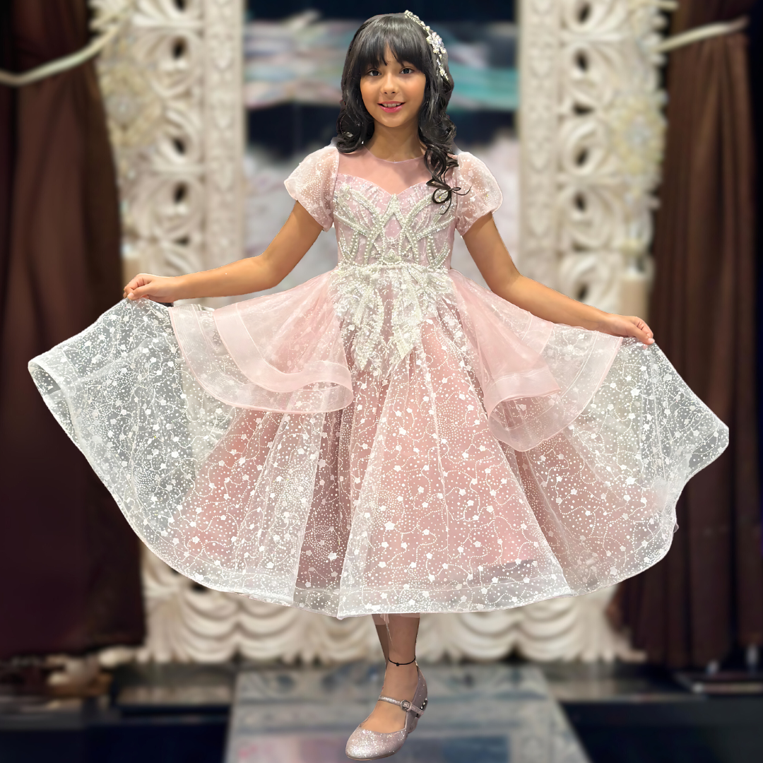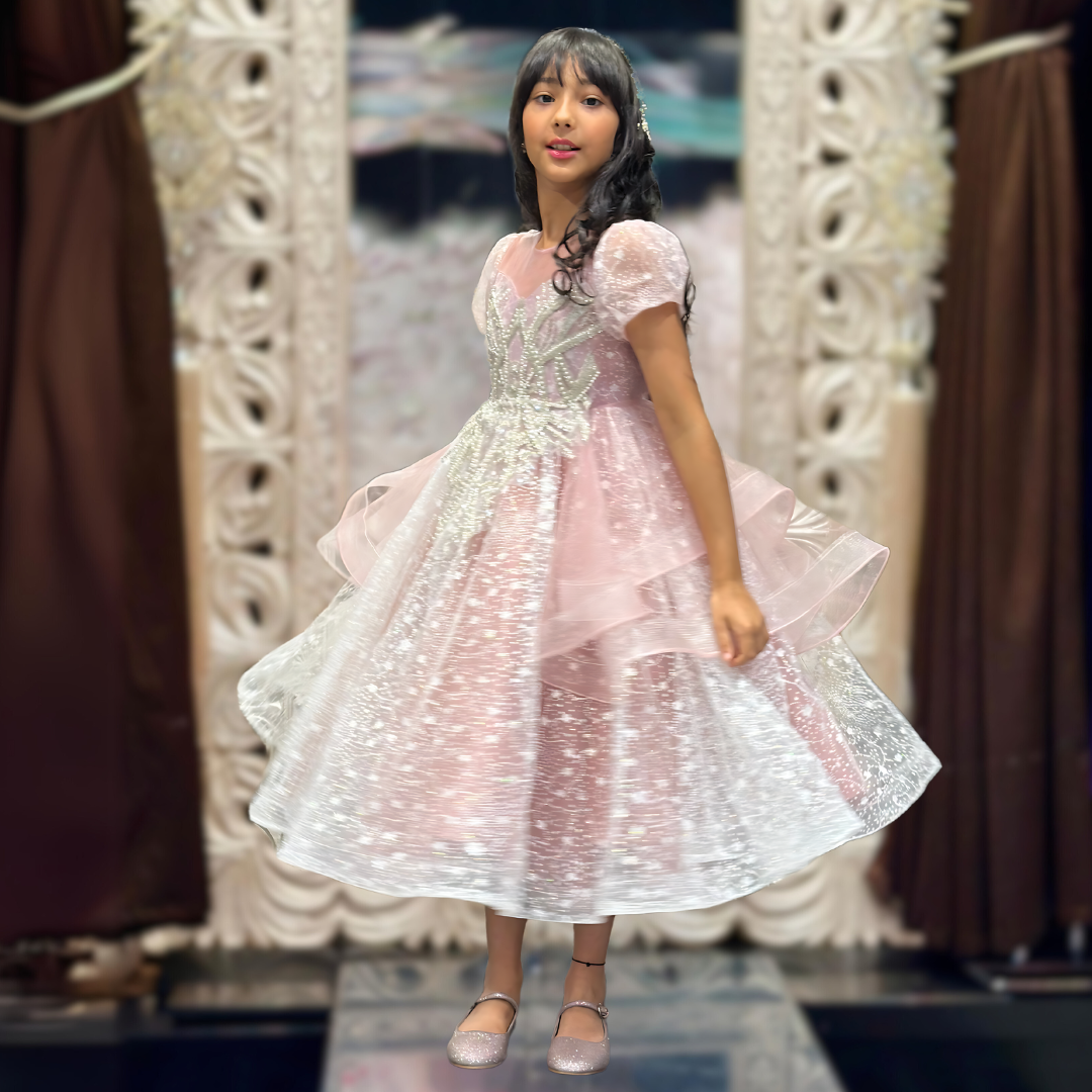 The dress made from a lightweight, sheer fabric, a combination of tulle or organza, embellished with sequins or embroidery for added sparkle. The inner lining is a soft cotton or polyester blend for comfort.