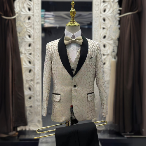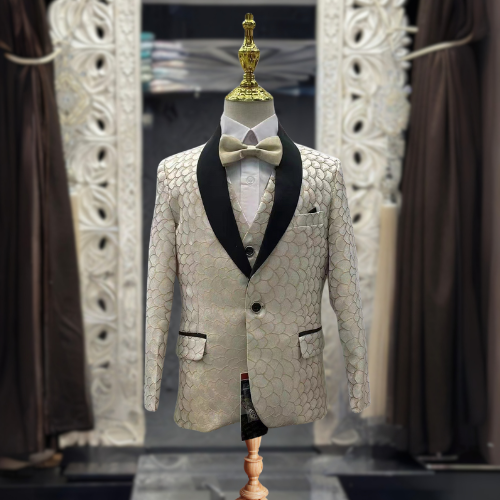 The blazer is champagne colored with a textured, scale-like pattern. It features a black satin lapel, adding a touch of sophistication. Underneath the blazer, there is a matching cream vest that complements the overall design. It has a light-colored bow tie neatly tied at the collar, enhancing the formal look. It is paired with a black pants to complete the look.