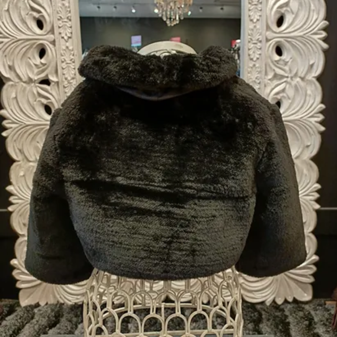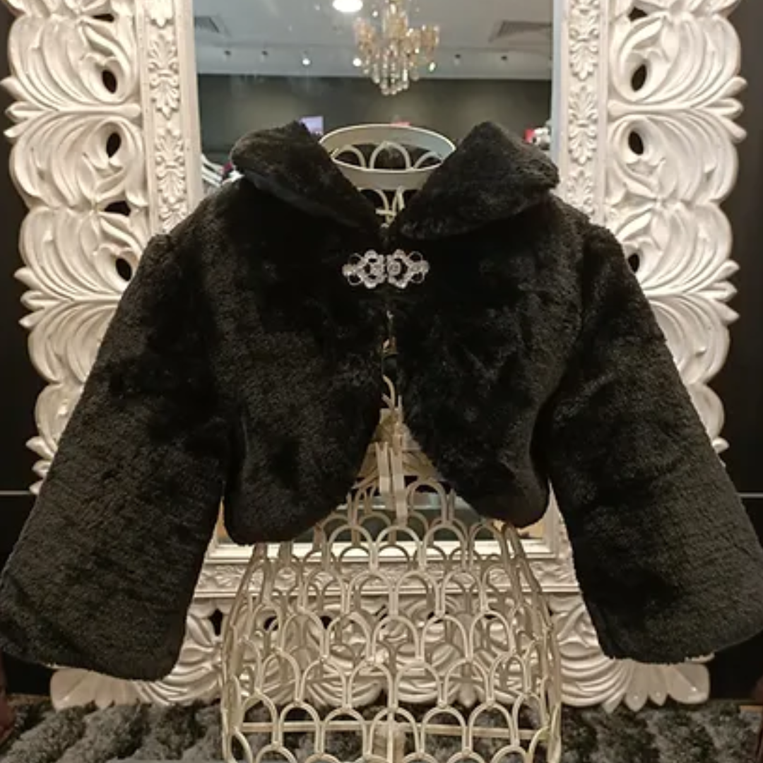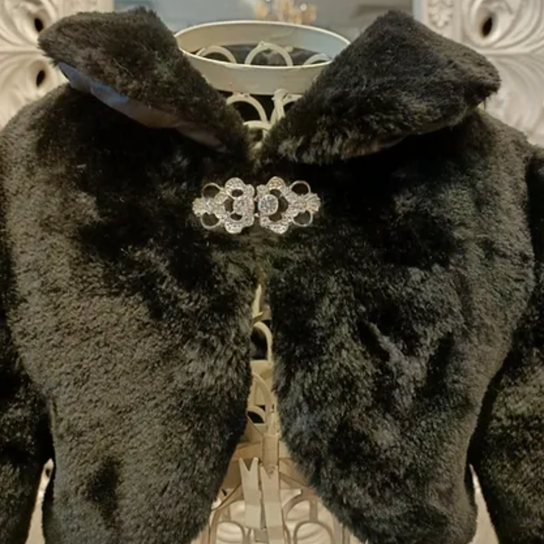 A luxurious fur shrug featuring a soft, elegant design, complemented by a statement brooch for added sophistication. Perfect for evening wear, this shrug adds a touch of glamour while providing warmth and style.