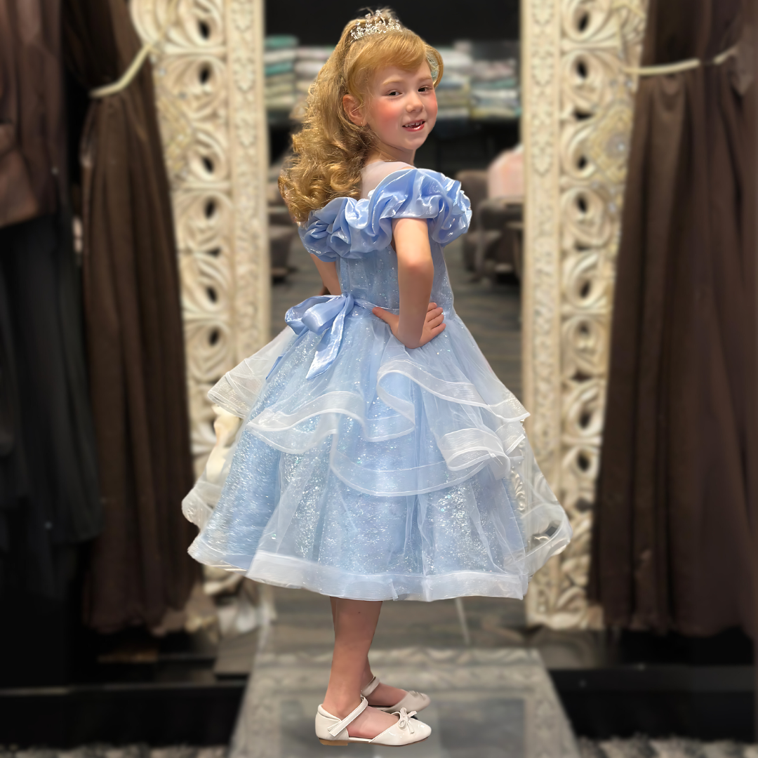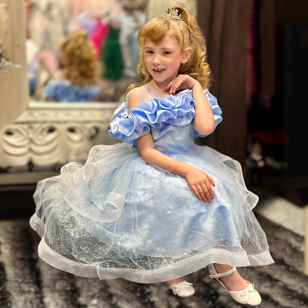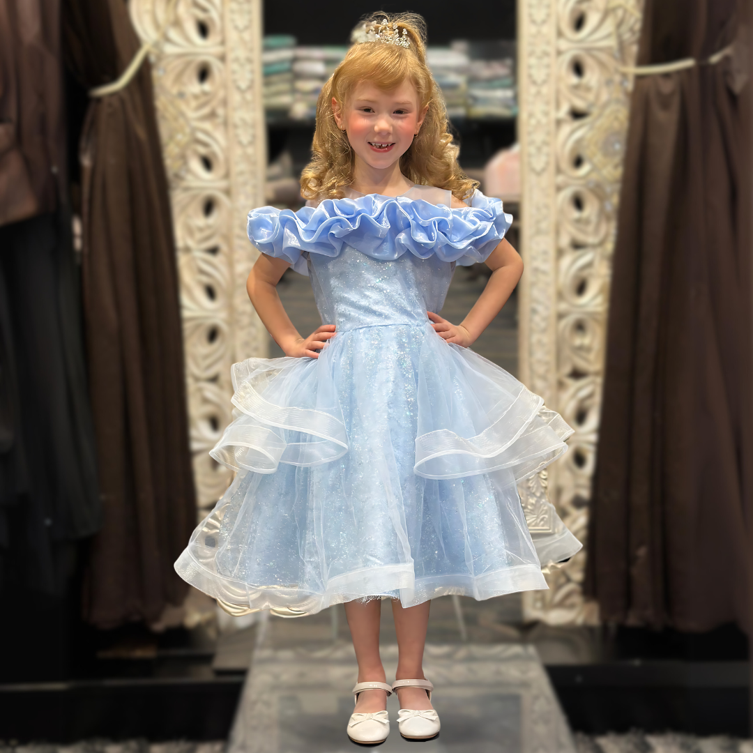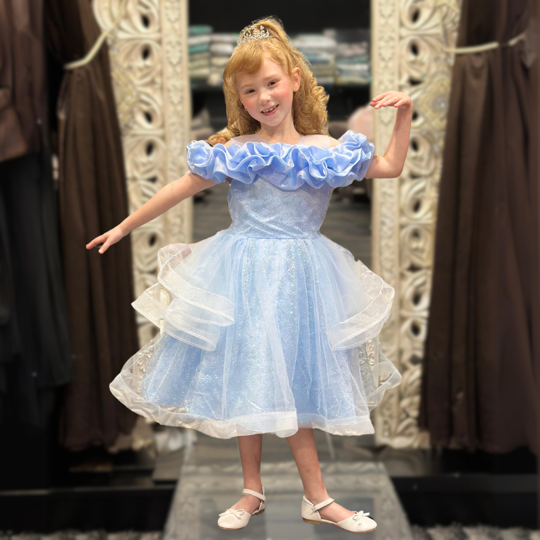 A beautiful powder blue dress that has a fitted bodice with an off-the-shoulder neckline, adorned with ruffles that add a touch of elegance. The skirt is voluminous and layered, made from a sheer fabric that creates a soft, flowing appearance. The overall design is whimsical and charming, perfect for a young girl or a themed event.