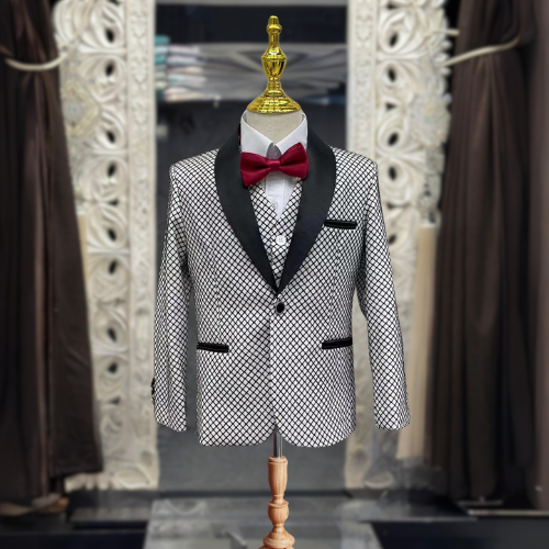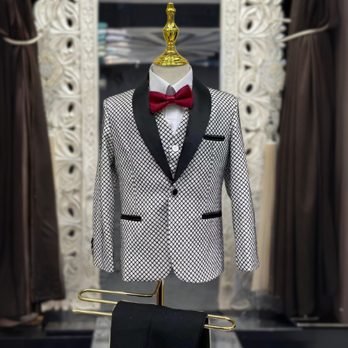 This is a stunning suit. The blazer is predominantly white with a black diamond pattern, featuring a black satin lapel. It has a single button closure and a pocket with a black trim. A red bow tie is neatly tied at the collar, adding a vibrant contrast to the outfit. Underneath the blazer, there is a white dress shirt visible at the collar. A pair of black trousers is hanging below, completing the formal look.