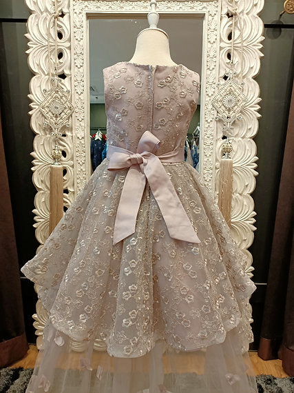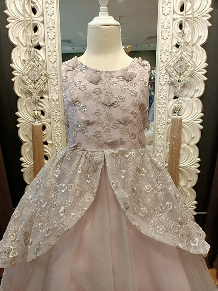 This beautiful breathtaking Kristina High-Low kids Gown features, a fully embroidered bodice all over, front and back. The bodice at the front comes with floral appliques. The embroidered tulle continues down the skirt in a high low pattern. The layer under the top mesh is a plain mesh with the embroidered border also consists of some floral appliques at the back of the skirt. This dress also features a matte satin size adjustable belt which can be tied up as a bow at the back. The dress has a cotton lining which goes good on the body.
