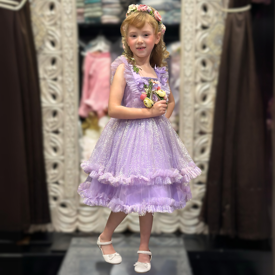 A lovely lavender dress designed for a young girl. It features a sleeveless bodice with wide straps and a ruffled neckline. The dress has a full, layered skirt that creates a voluminous silhouette, made from a sheer, sparkly fabric that adds a whimsical touch. The layers of ruffles at the hem enhance its playful and elegant appearance, making it suitable for special occasions or celebrations.