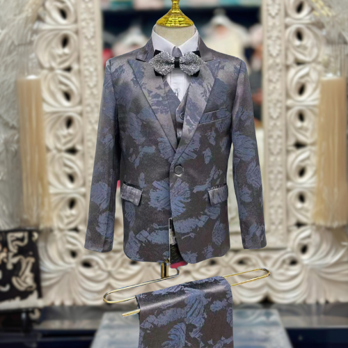 A gorgeous suit with blue blazer and floral pattern in darker shades, featuring a single button closure and a classic notch lapel. Underneath the blazer, there is a matching vest that continues the floral design, adding depth to the outfit. A decorative bow tie in a similar tone is neatly tied at the collar, enhancing the formal appearance. A pair of matching trousers is hanging below, completing the ensemble.