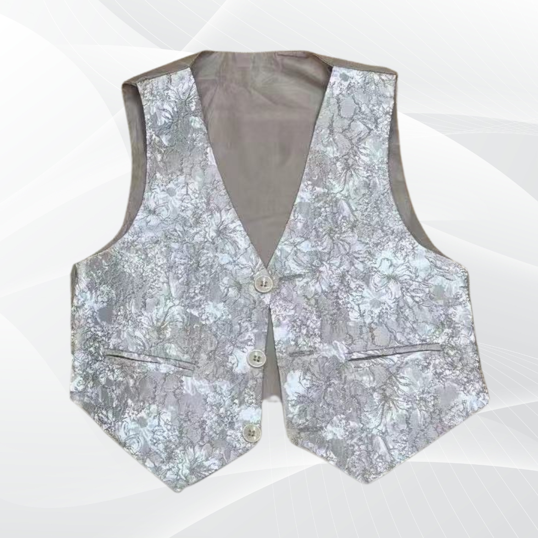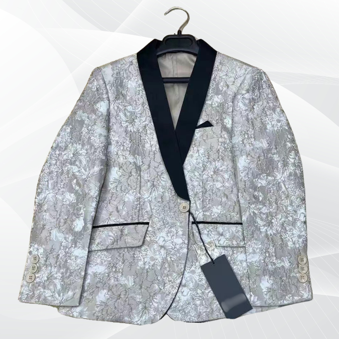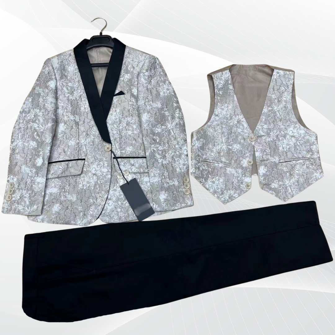 A stylish formal outfit consisting of a floral-patterned blazer, a matching vest, and a pair of black trousers. The blazer features a light-colored floral design with a black satin lapel, giving it a sophisticated and elegant appearance. The vest is a solid light color, complementing the blazer and designed with buttons. The trousers are black, providing a classic contrast to the patterned blazer and vest.