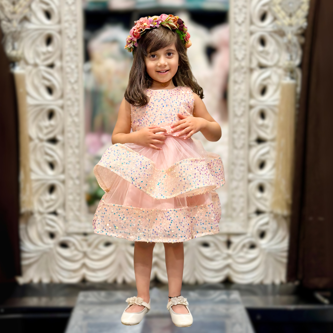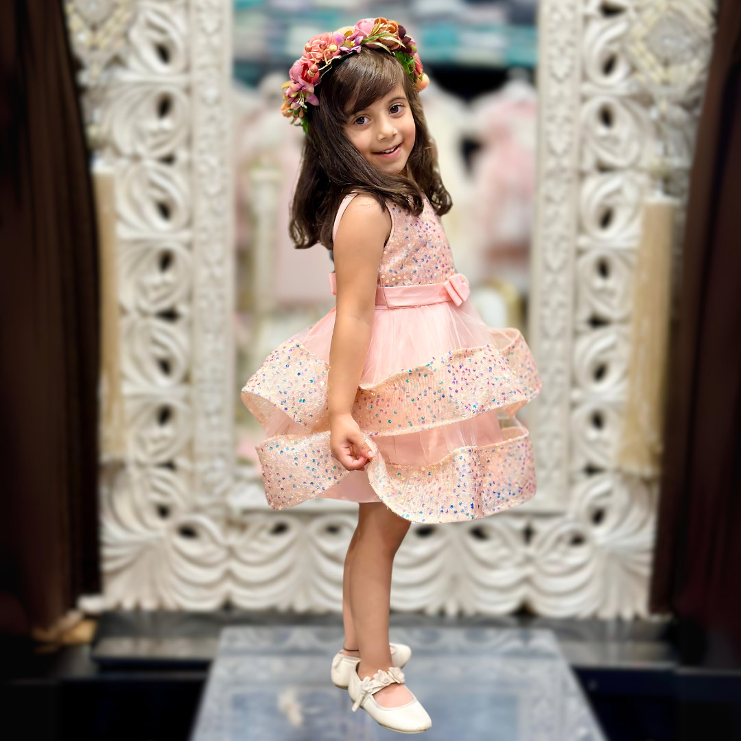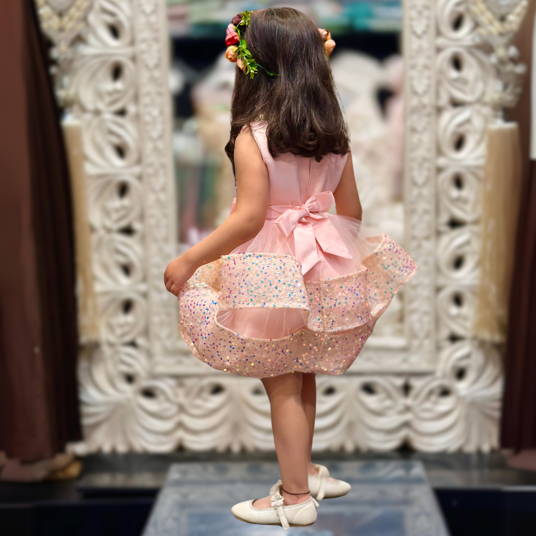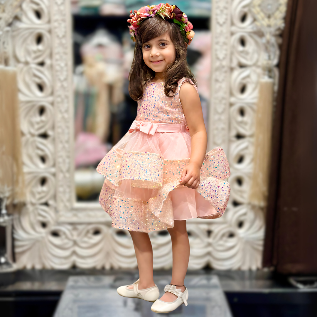 This charming pink dress has a sleeveless bodice adorned with sparkling sequins that catch the light beautifully. It features a layered skirt made of soft tulle, with three tiers that create a lovely, voluminous effect. A delicate pink ribbon with a bow and a small embellishment sits at the waist, adding an elegant touch.