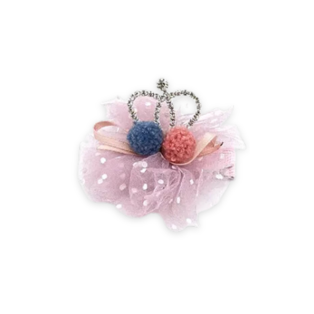 This Pom pom Crown hair clip features a flower made of organza with white polka dots, two pom pom with a bow and a beaded crown on it.