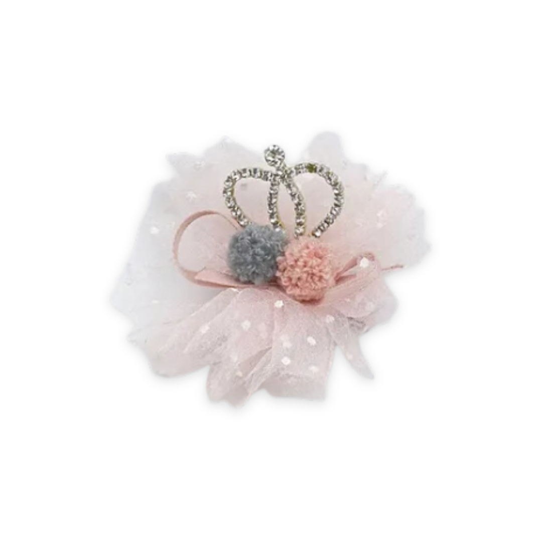 This Pom pom Crown hair clip features a flower made of organza with white polka dots, two pom pom with a bow and a beaded crown on it.