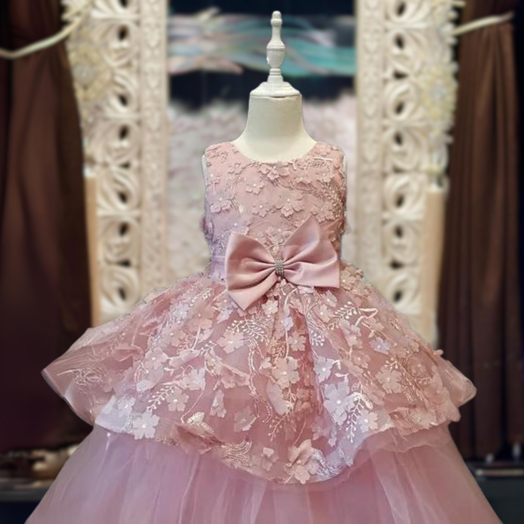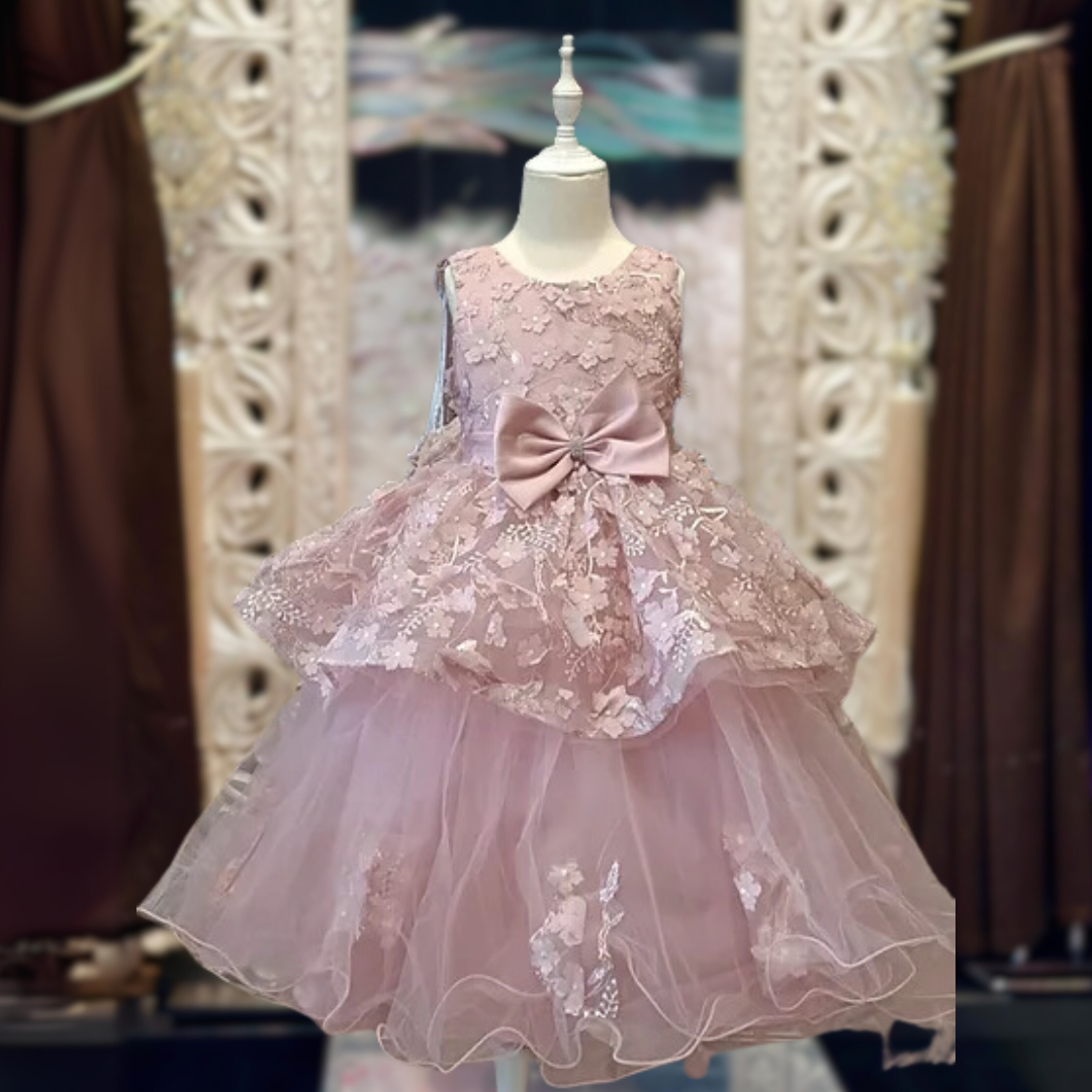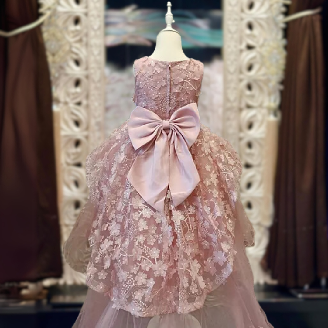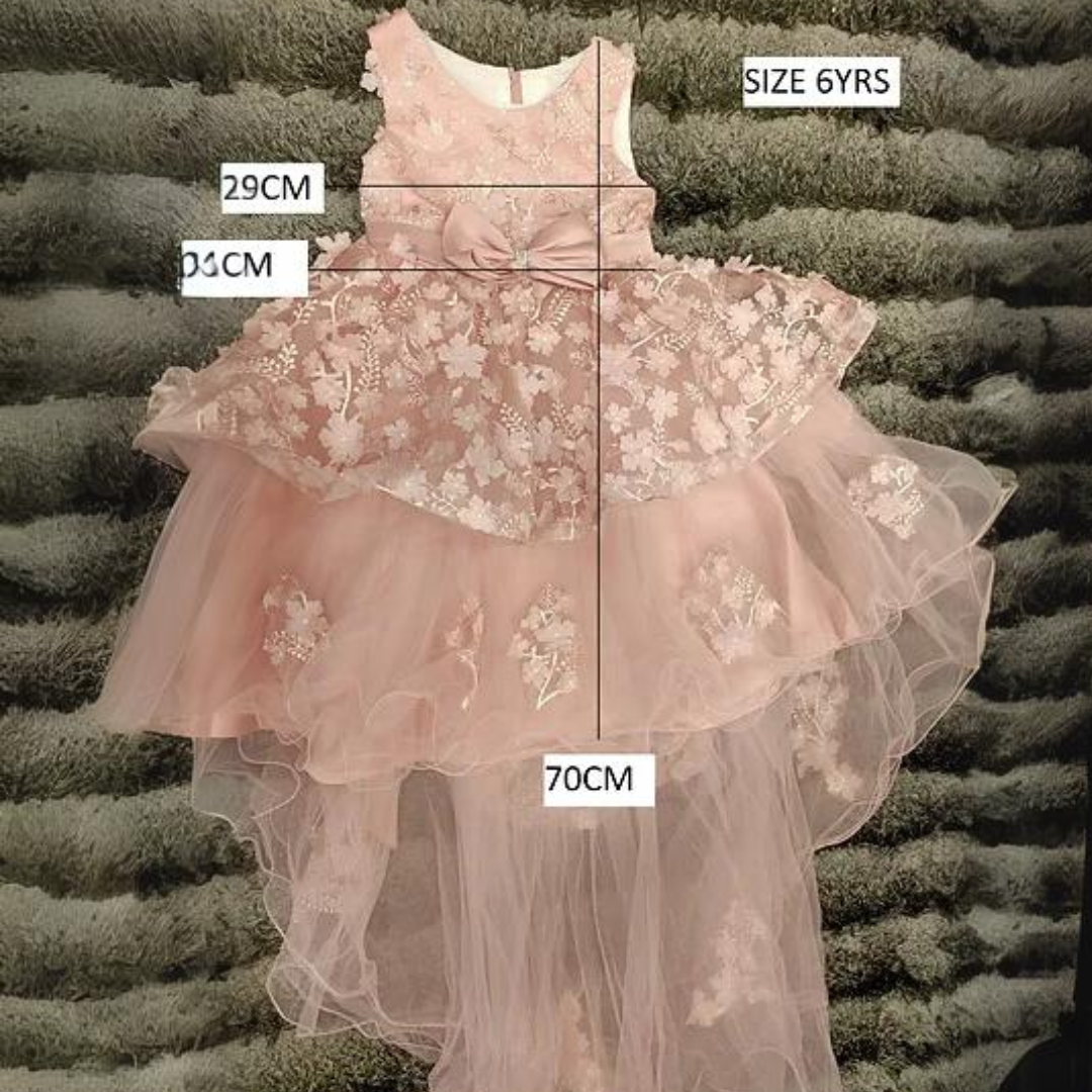 This dress features, a high-low tulle with a beautiful embroidery with floral appliques which covers the bodice, followed by the plain tulle which has patches at the bottom. This high-low dress is down the knee long in the front and floor length at the back. It also has a satin belt with a bow attached to it, helps in adjusting the size of the bodice and is so long that it can to knotted up as a bow at the back. It has a cotton lining all over the dress.