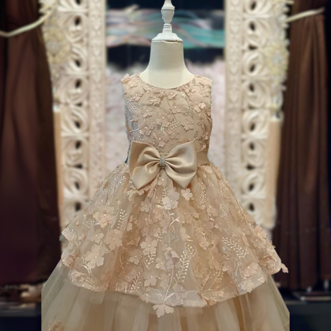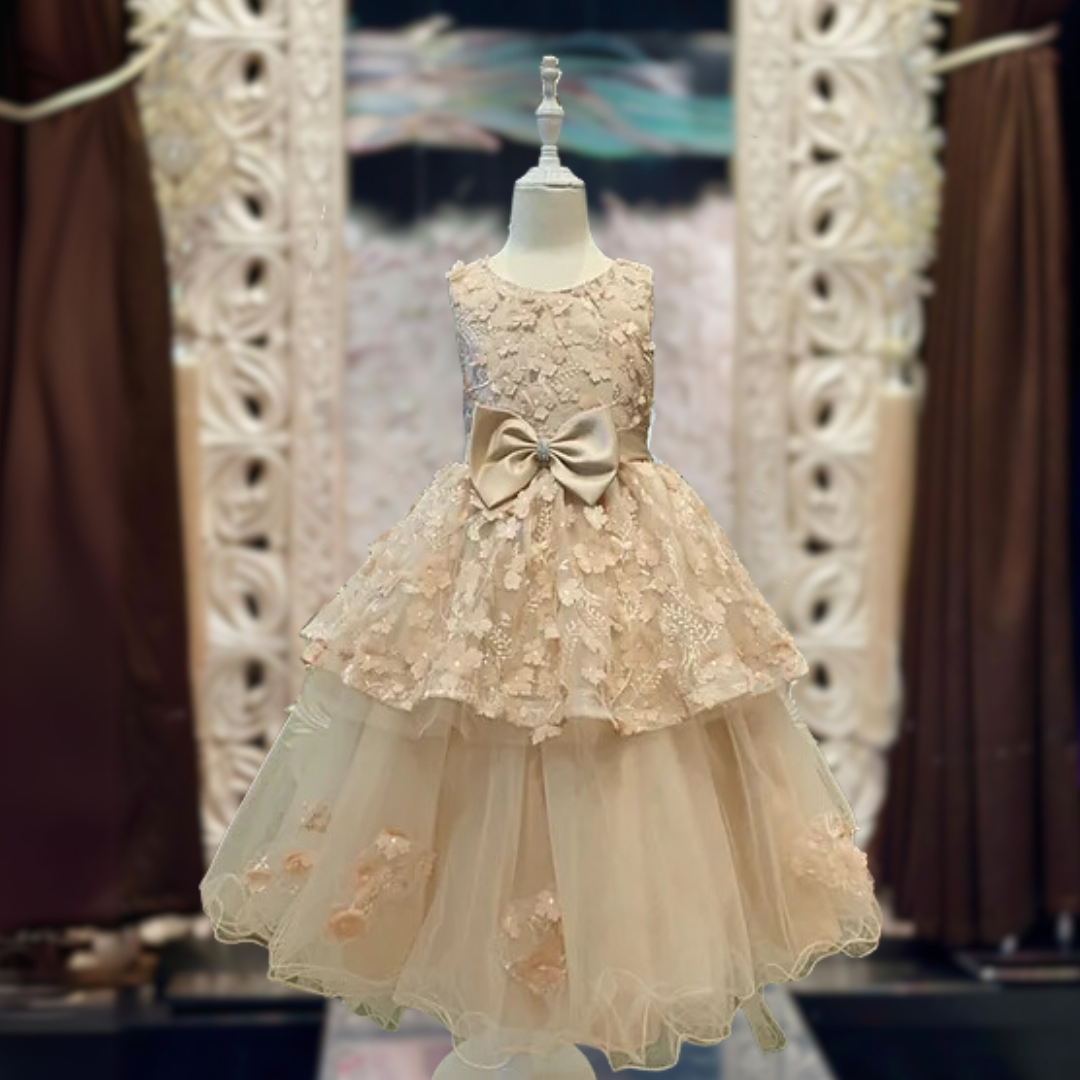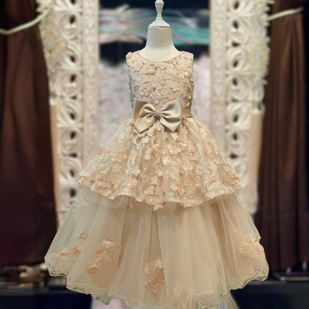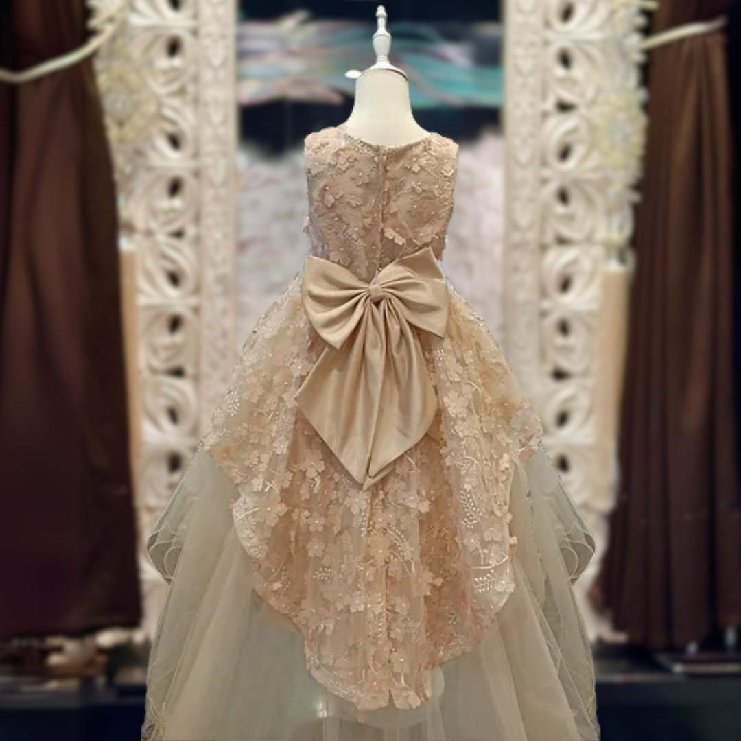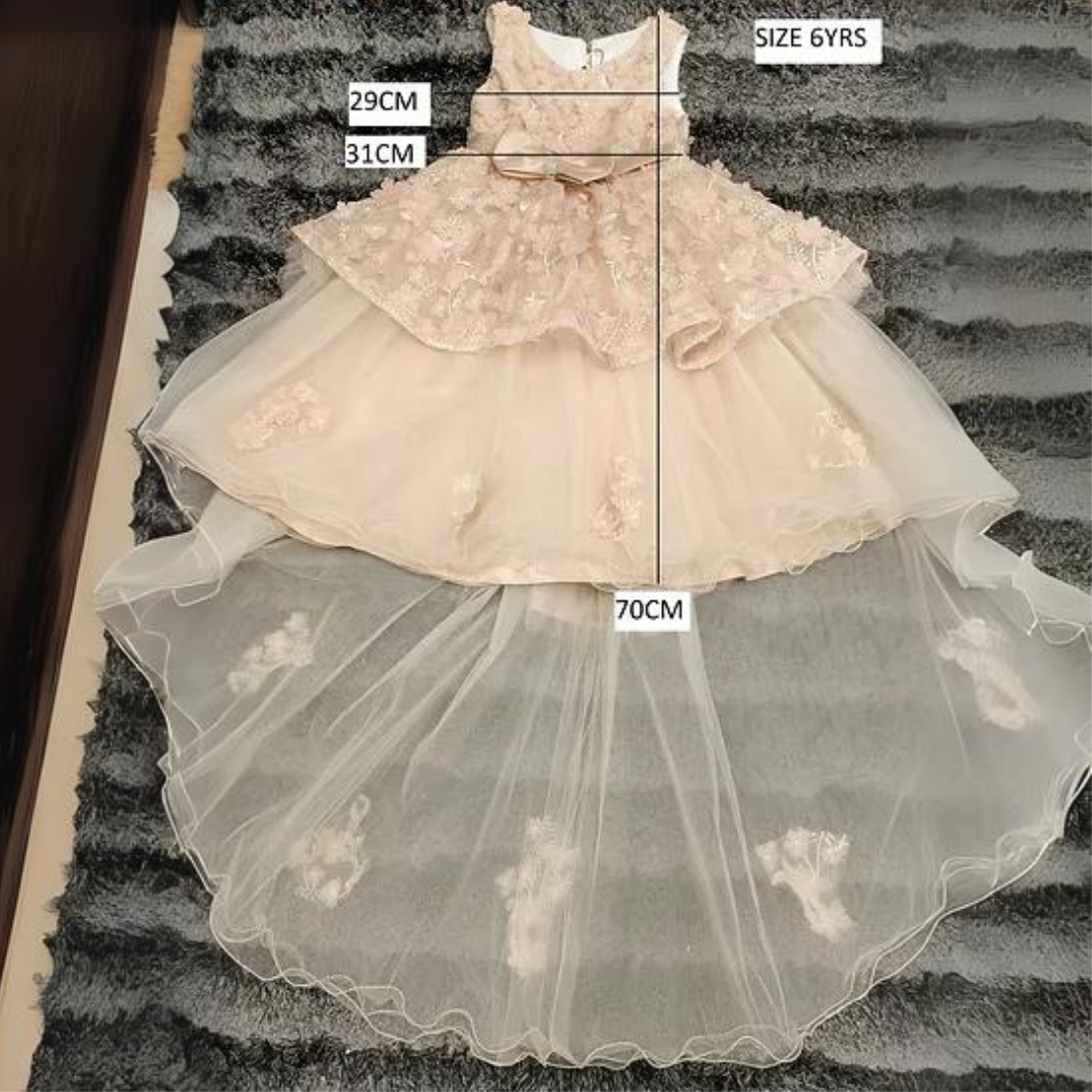 This dress features, a high-low tulle with a beautiful embroidery and floral appliques which covers the bodice, followed by the plain net which has patches at the bottom. This high-low dress is down the knee in the front and floor length at the back. It also has a satin belt with a bow attached to it, helps in adjusting the size of the bodice and is so long that it can to knotted up as a bow at the back. It has a cotton lining all over the dress.
