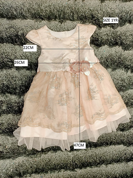 Here is one such comfy dress featuring, cap sleeves, soft mesh with glittery floral embroidery starting from bodice down till the skirt. This acts as a top layer of the skirt and there is another layer down that which is a plain mesh. There is a matte satin belt which helps in adjusting the size of the bodice by tying it at the back.